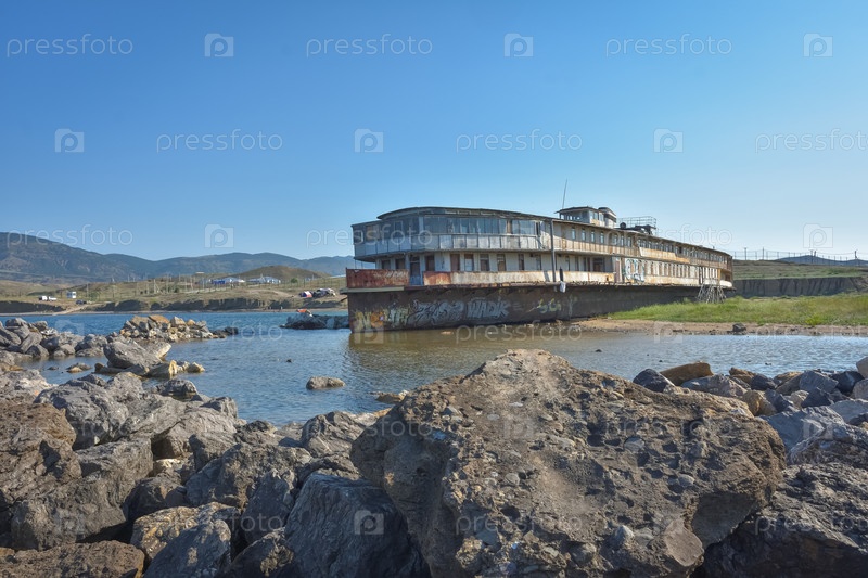 Судак, Крым, Россия - 10 июля 2021 года: заброшенный пароход, севший на мель, старый ржавый круизный пароход, скелет корабля, севший корабль