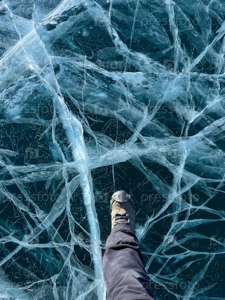 Нога туриста, стоящего на поверхности трещины замерзшего озера Байкал в зимний сезон Сибири, Россия