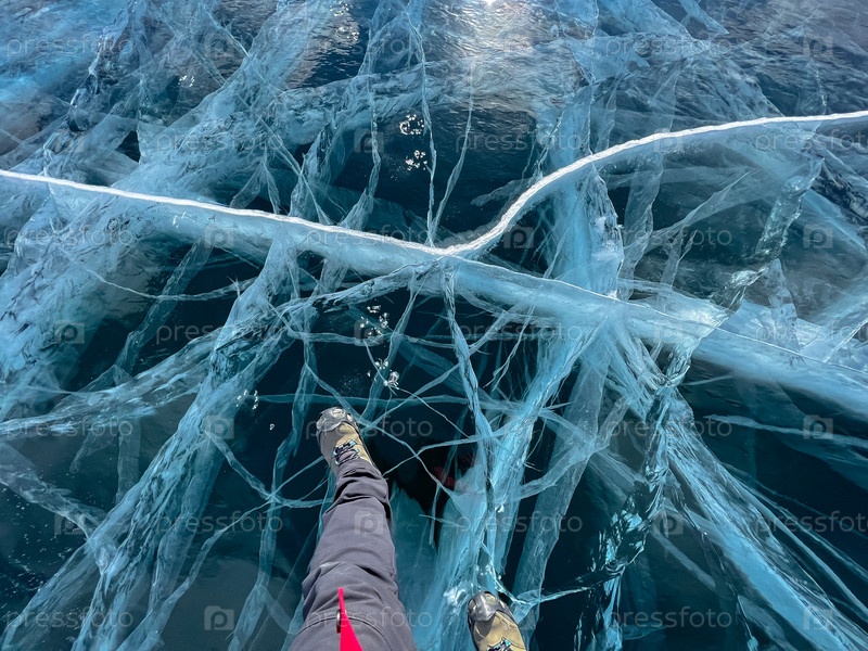 Нога туриста, стоящего на поверхности трещины замерзшего озера Байкал в зимний сезон Сибири, Россия