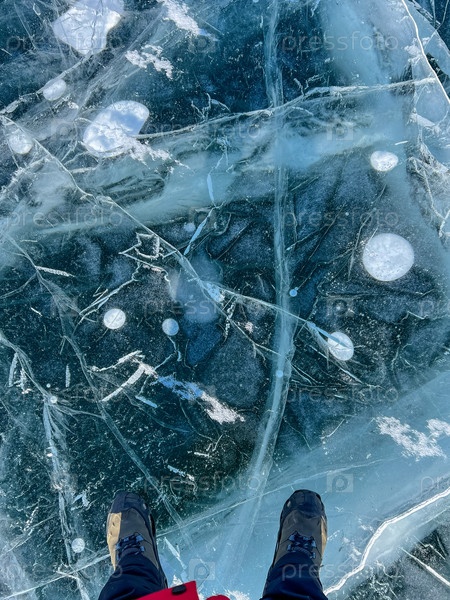 Естественная текстура зимнего льда с белыми пузырьками и трещинами на замерзшем озере. Абстрактный фон льда и трещин на поверхности замерзшего озера Байкал