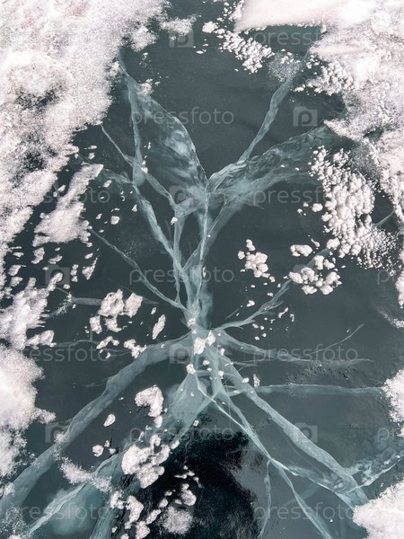 Естественная текстура зимнего льда с белыми пузырьками и трещинами на замерзшем озере. Абстрактный фон льда и трещин на поверхности замерзшего озера Байкал