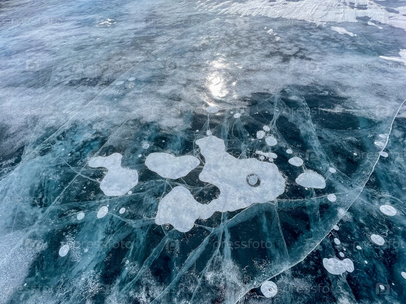 Естественная текстура зимнего льда с белыми пузырьками и трещинами на замерзшем озере. Абстрактный фон льда и трещин на поверхности замерзшего озера Байкал