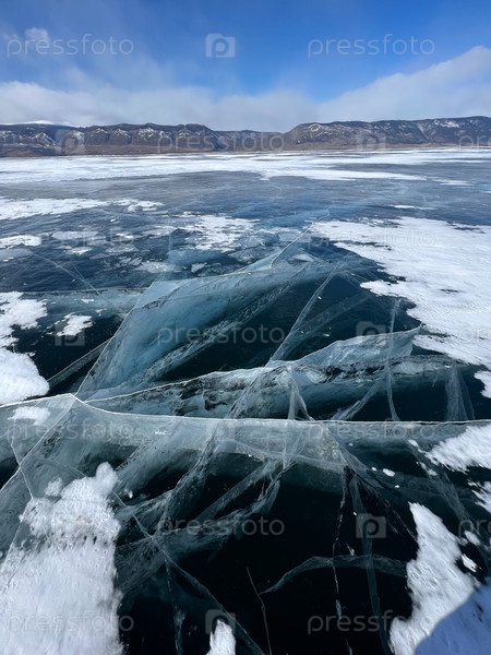 Естественная текстура зимнего льда с белыми пузырьками и трещинами на замерзшем озере. Абстрактный фон льда и трещин на поверхности замерзшего озера Байкал