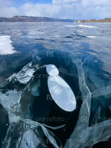 Естественная текстура зимнего льда с белыми пузырьками и трещинами на замерзшем озере. Абстрактный фон льда и трещин на поверхности замерзшего озера Байкал
