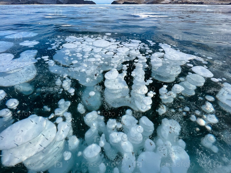 Естественная текстура зимнего льда с белыми пузырьками и трещинами на замерзшем озере. Абстрактный фон льда и трещин на поверхности замерзшего озера Байкал
