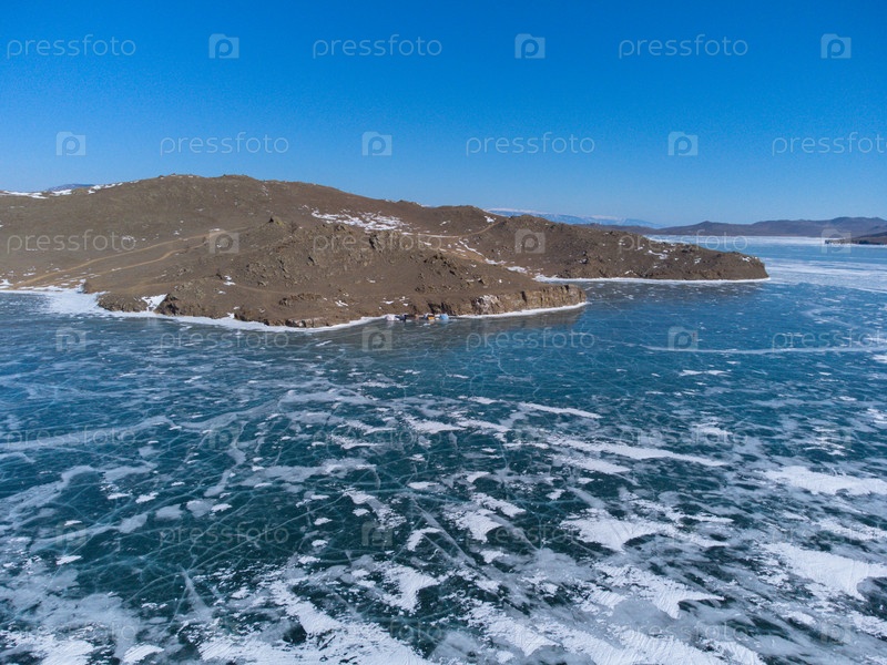 Чистый лед замерзшего озера Байкал на фоне гор. замерзший зимний байкал