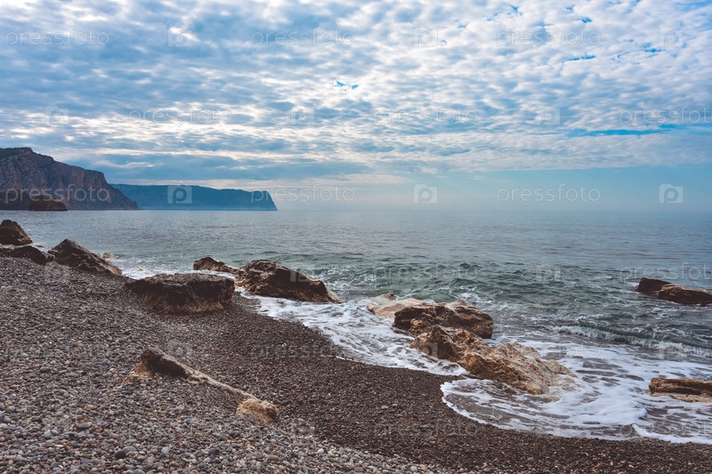 Скалистый берег Черного моря, пейзаж со скалами на берегу моря, скалы, торчащие из моря