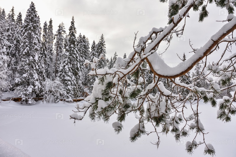 Зима в еловом лесу, ели покрыты белым пушистым снегом. Выборочный фокус. Зимний пейзаж со снегом и деревьями. Заснеженные деревья в лесу зимой