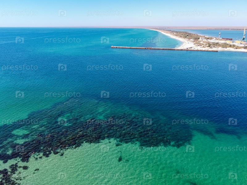 Вид с воздуха на тропический песчаный пляж, разделяющий экзотическое бирюзовое море и озеро. песчаная коса в море сверху, полет над песчаной косой и разноцветное море