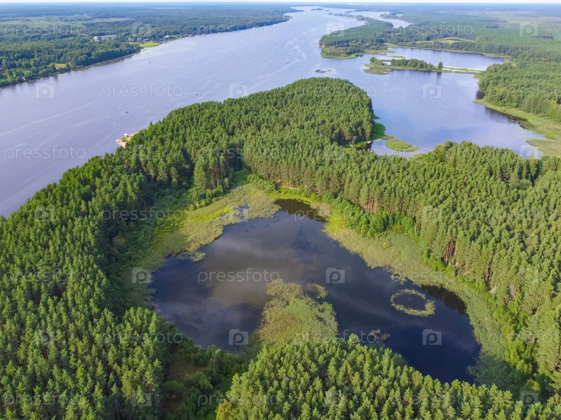 Полет над рекой, река в лесу с высоты птичьего полета