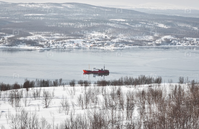 Корабль плывет по морю на фоне заснеженных гор