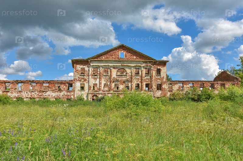 Заброшенная усадьба из красного кирпича в окружении зелени на фоне неба