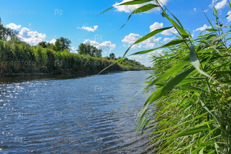 Река течет между рогозом в облачном небе