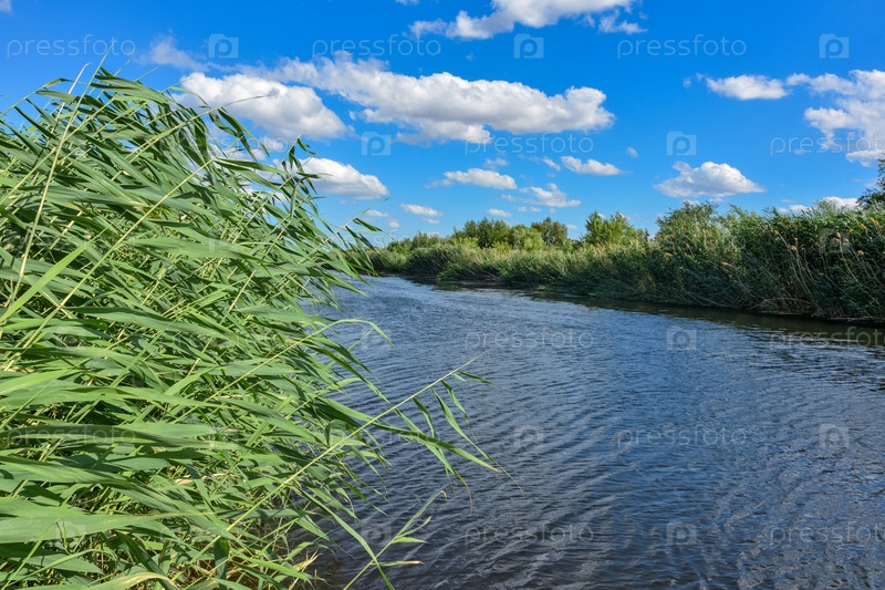 Река течет между рогозом в облачном небе