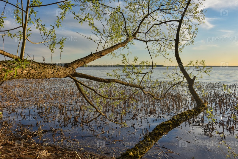 Дерево сбрасывает ветки в реку на закате