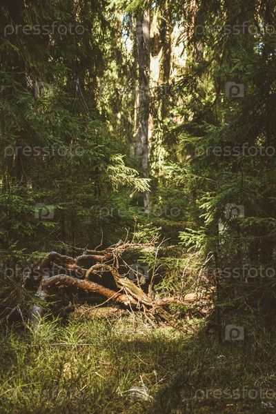 Глубокий весенний лес с теплым солнечным светом. Заросли с богатой растительностью. Глубокие вечнозеленые чащи лесной природы. Упавшие сухие ветки в лесной чаще