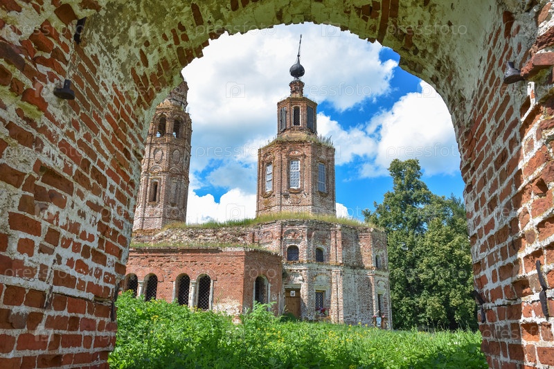 Заброшенная полуразрушенная церковь, заросшая травой на фоне неба, в окружении зелени, вид через арку