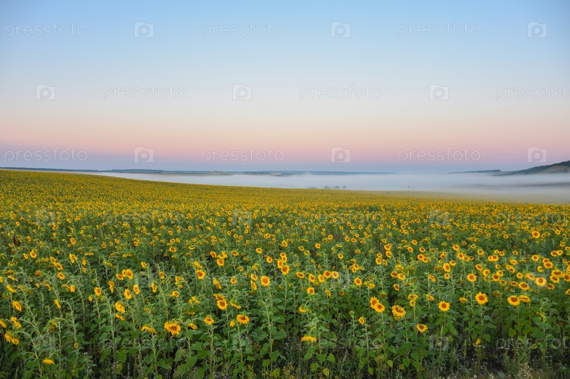 Поле подсолнухов в утреннем тумане, луг в тумане, утренний туман в поле