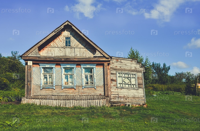 Деревянный дом в деревне на фоне неба в окружении зелени