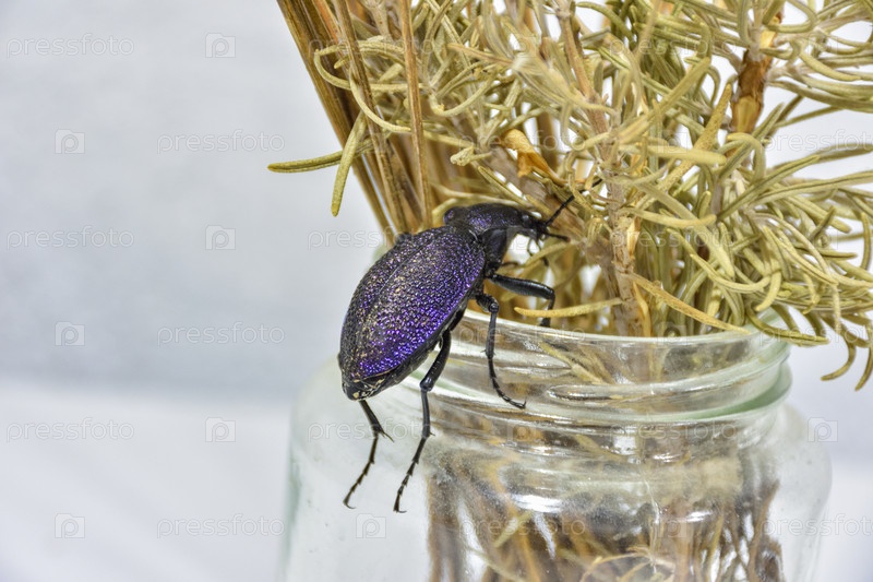 Фиолетовый крупный план жужелицы на траве, жук на сухой траве
