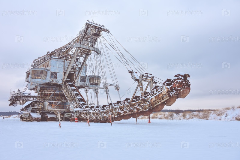 Заброшенный гигантский роторный экскаватор стоит в поле зимой