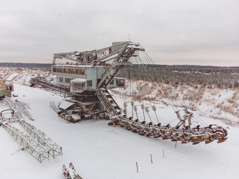 Заброшенный гигантский роторный экскаватор стоит в поле зимой