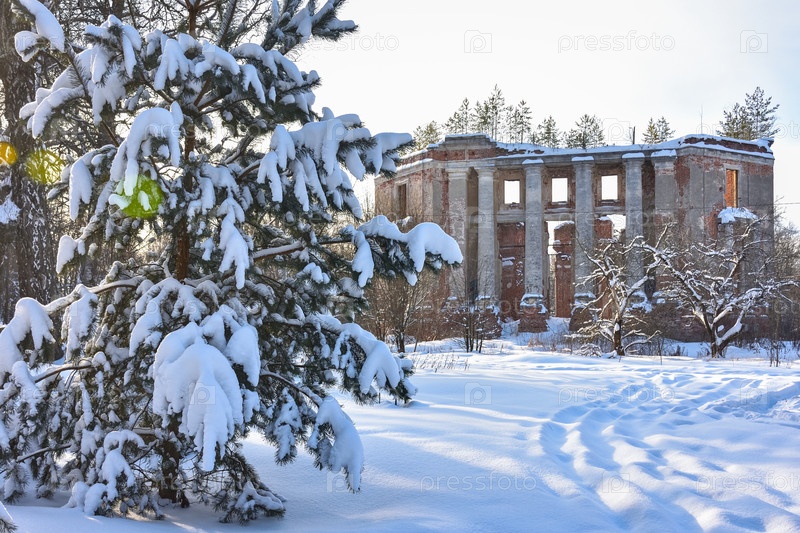 Заброшенная усадьба с колоннами, руины усадьбы зимой