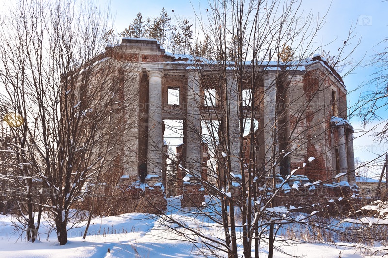 Заброшенная усадьба с колоннами, руины усадьбы зимой