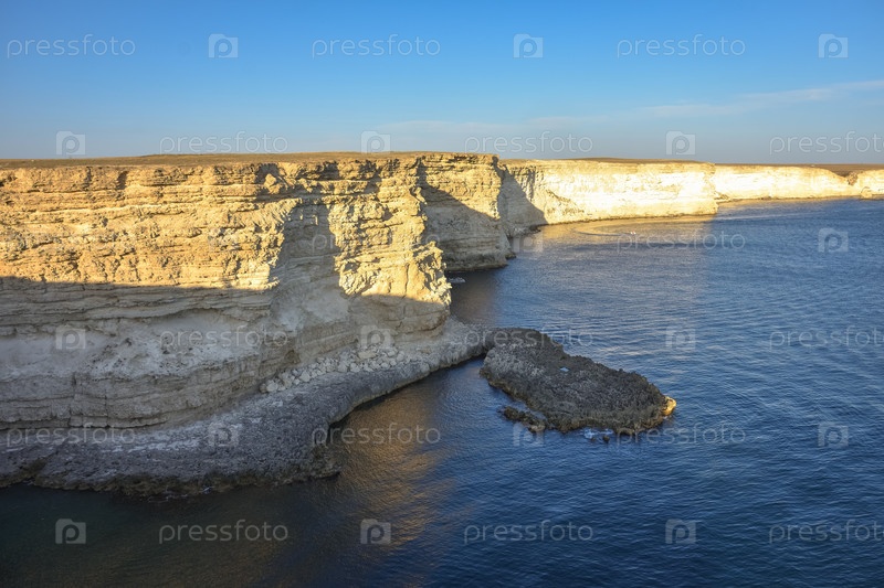 Мыс Тарханкут с бирюзовой водой на западном побережье полуострова Крым. Летний морской пейзаж, известное туристическое направление. Живописный морской пейзаж, пляж побережья Крыма Черное море Ялтинские горы. Скалистый утес в море