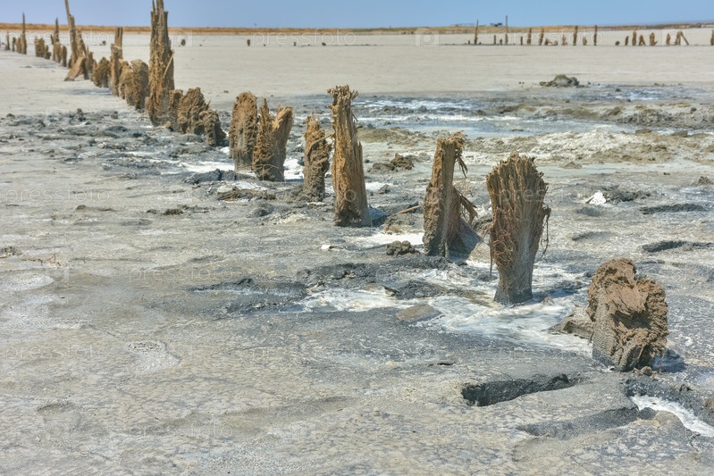 Потрясающая белая соляная пустыня или соляное озеро. остатки деревянного здания в соленом озере. высохшее соленое озеро, изъеденное солью здание, гнилое деревянное здание