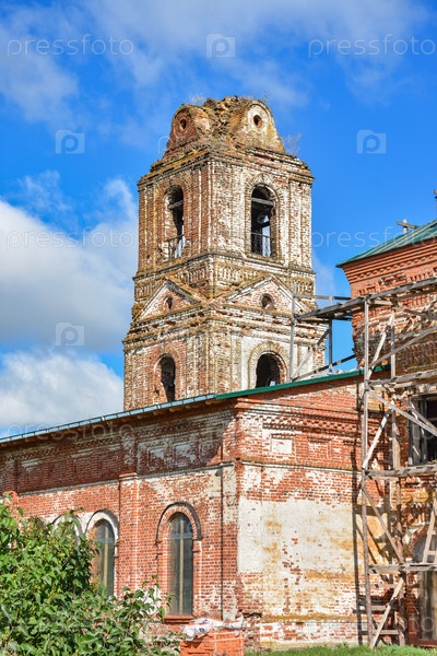 Часть разрушенной церкви с заросшей травой колокольней на фоне облачного неба, крупный план