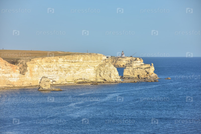 Мыс Тарханкут с бирюзовой водой на западном побережье полуострова Крым. Летний морской пейзаж, известное туристическое направление. Живописный морской пейзаж, пляж побережья Крыма Черное море Ялтинские горы. Скалистый утес в море