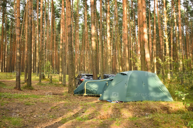 Палатка в сосновом лесу, кемпинг в лесу