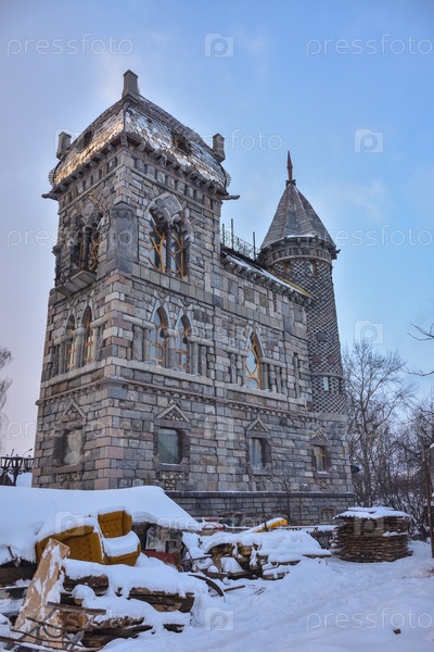 Готический замок зимой, вид снаружи, на фоне неба, зимние деревья