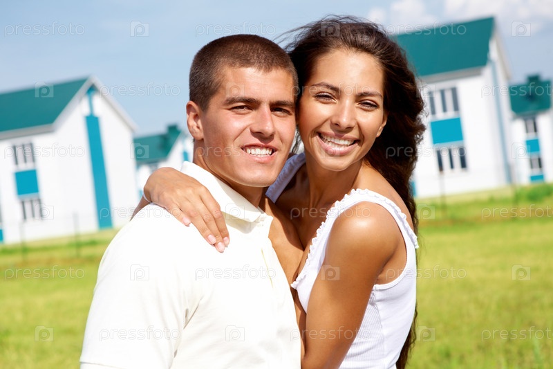Счастливая пара на фоне жилых домов