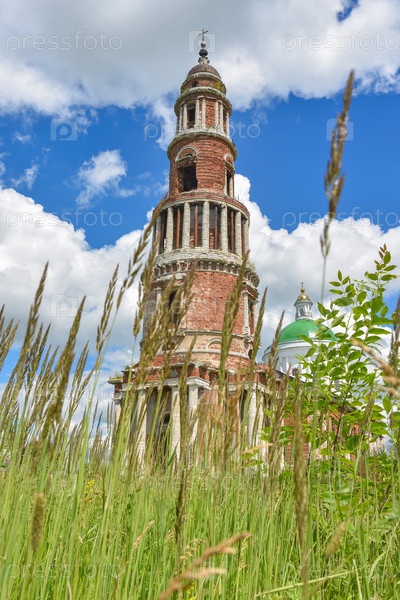 Заброшенная колокольня с крестом на заднем плане, из кирпича с колоннами на фоне неба, трава на переднем плане