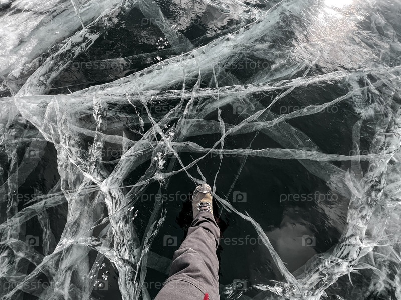 Нога туриста, стоящего на поверхности трещины замерзшего озера Байкал в зимний сезон Сибири, Россия