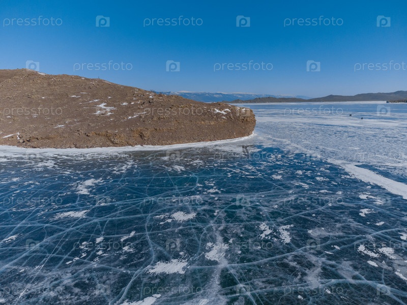 Чистый лед замерзшего озера Байкал на фоне гор. замерзший зимний байкал