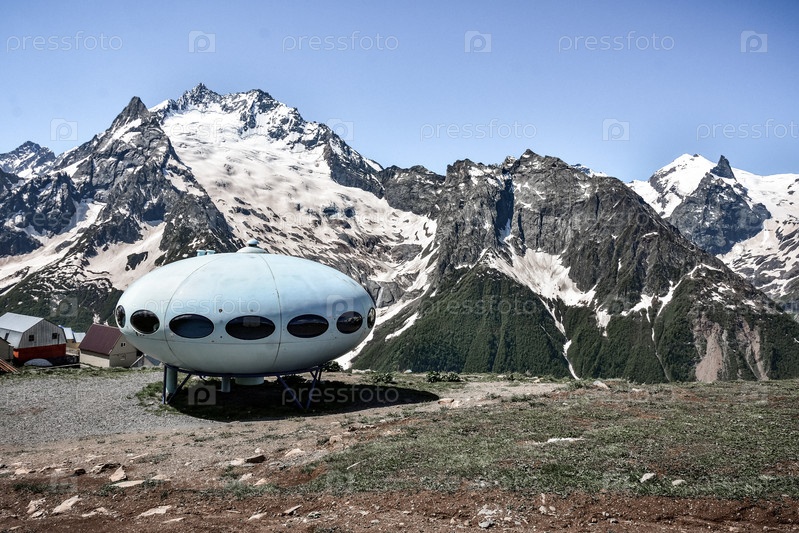 Домбай, Россия - 11 июня 2022 года: отель в виде летающей тарелки на горе, летающей тарелки в горах, НЛО в горах