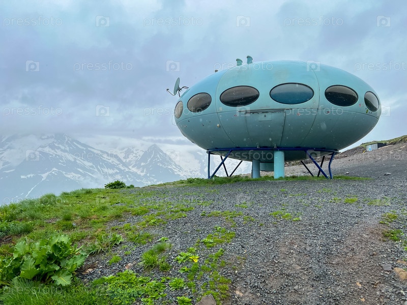Домбай, Россия - 09 июня 2022 года: отель в виде летающей тарелки на горе, летающей тарелки в горах, НЛО в горах