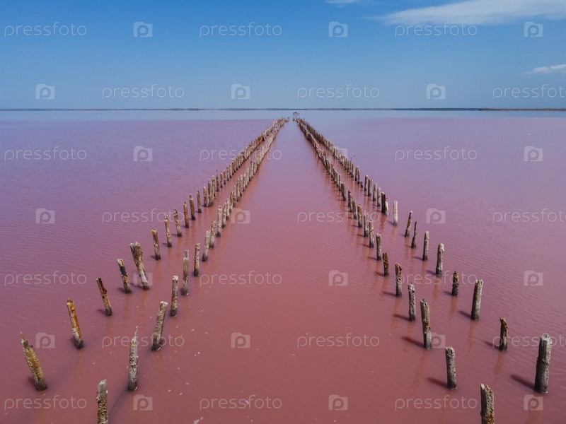 Деревянные пирсы в соленом озере, деревянные останки в розовом озере