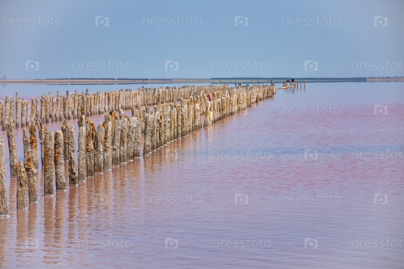 Деревянные пирсы в соленом озере, деревянные останки в розовом озере