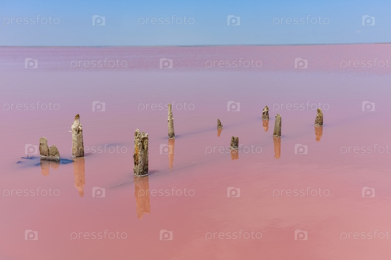 Деревянные пирсы в соленом озере, деревянные останки в розовом озере