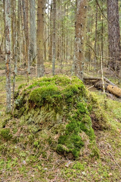 Зеленый мох на пне, мох в лесу