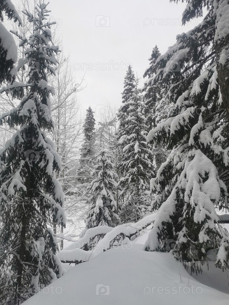 Зима в еловом лесу, ели покрыты белым пушистым снегом. Выборочный фокус. Зимний пейзаж со снегом и деревьями. Заснеженные деревья в лесу зимой