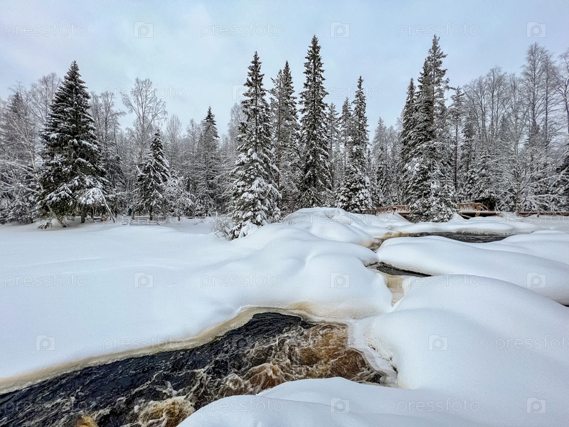 Зима в еловом лесу, ели покрыты белым пушистым снегом. Выборочный фокус. Зимний пейзаж со снегом и деревьями. Заснеженные деревья в лесу зимой