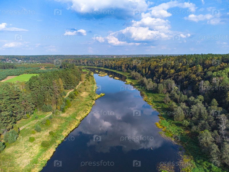 Полет над рекой, река в лесу с высоты птичьего полета