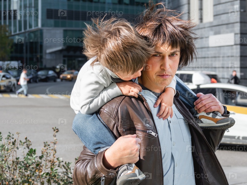 Маленький мальчик сидит на плечах отца между небоскребами. Папа и сын смотрят на стеклянные стены зданий. Будущее и современные технологии, жизненный баланс и семейная жизнь в благополучных районах