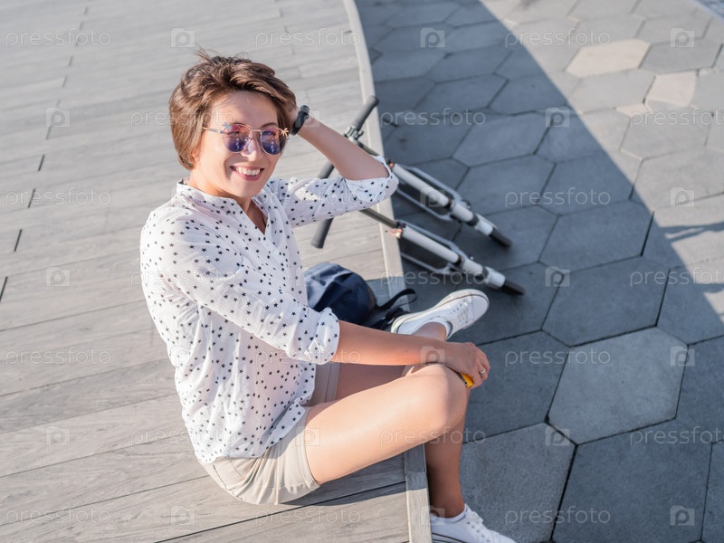 Ветер ерошит короткие волосы женщины в красочных солнцезащитных очках. Улыбающаяся женщина на открытой деревянной сцене. Летние вибрации. Искренние эмоции. Самокат - экологичный городской транспорт