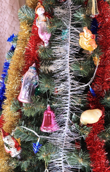 Игрушки на зеленой рождественской ели